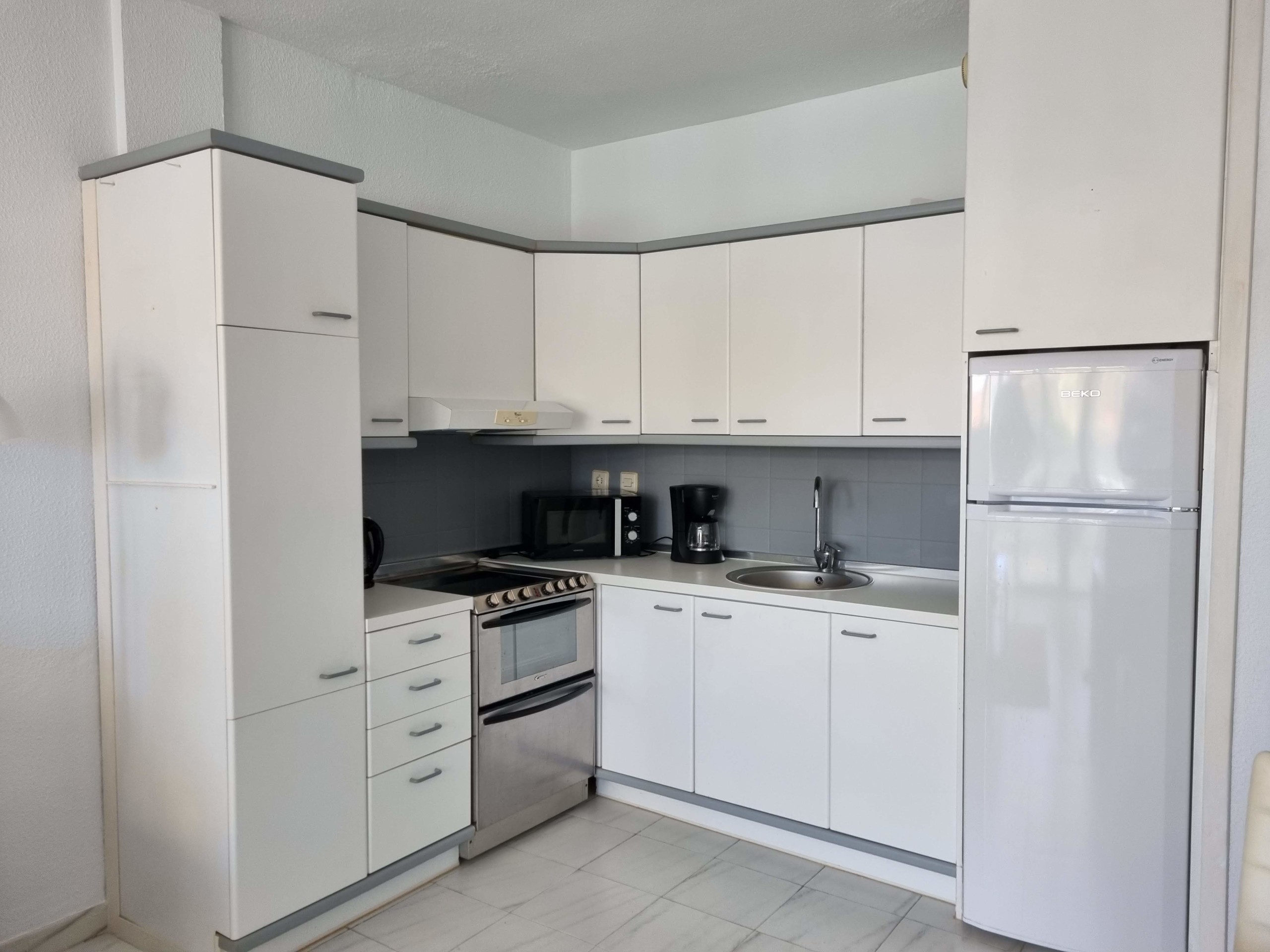 Hyvin varustellussa avokeittiössä kaikki tarvittavat kodinkoneet (uuni, kahvinkeitin, mikro jne).