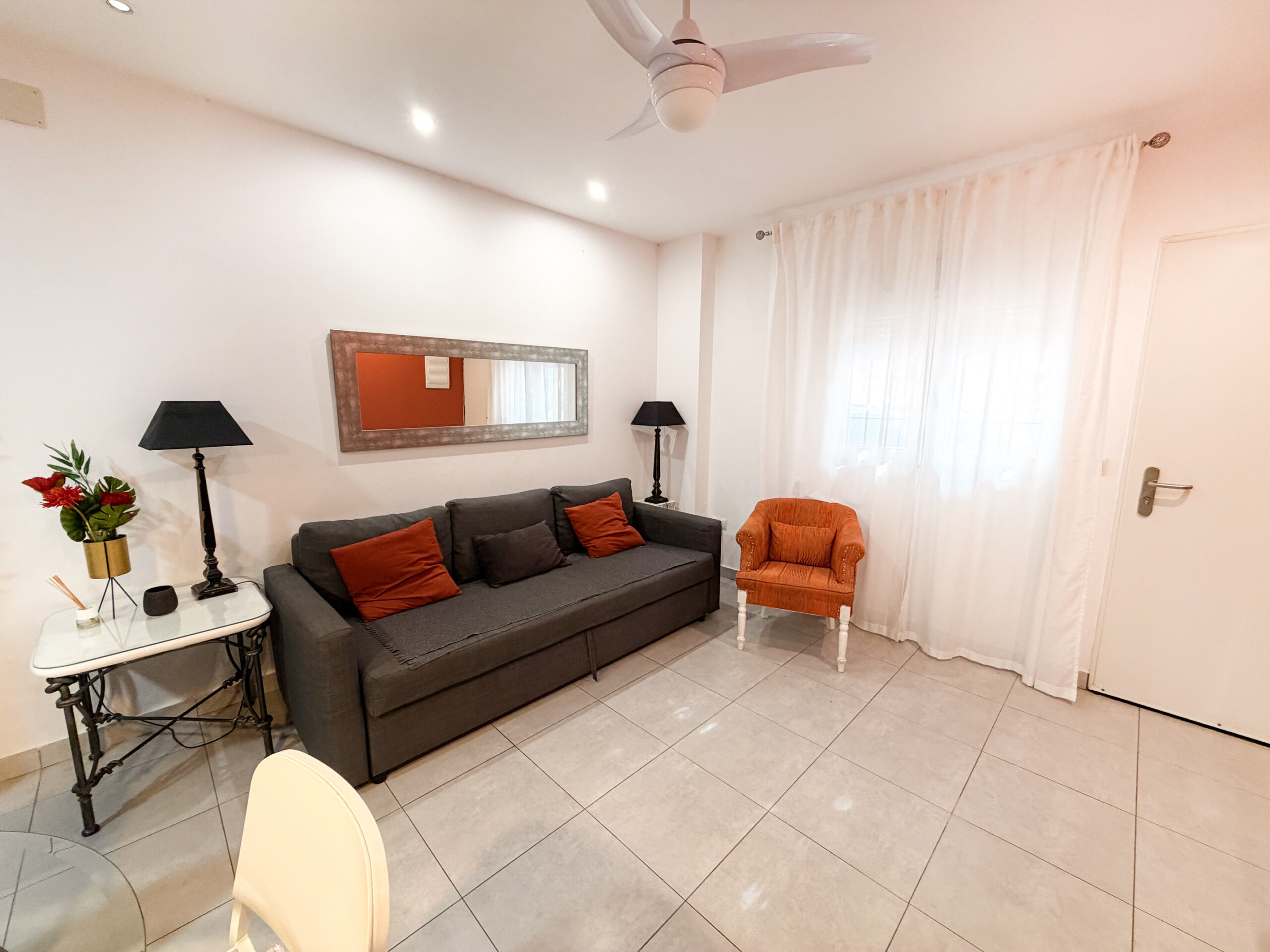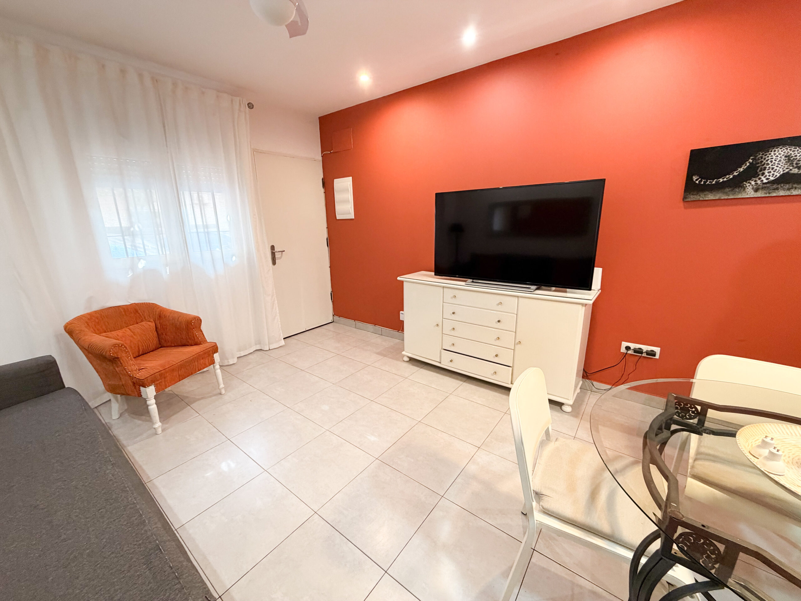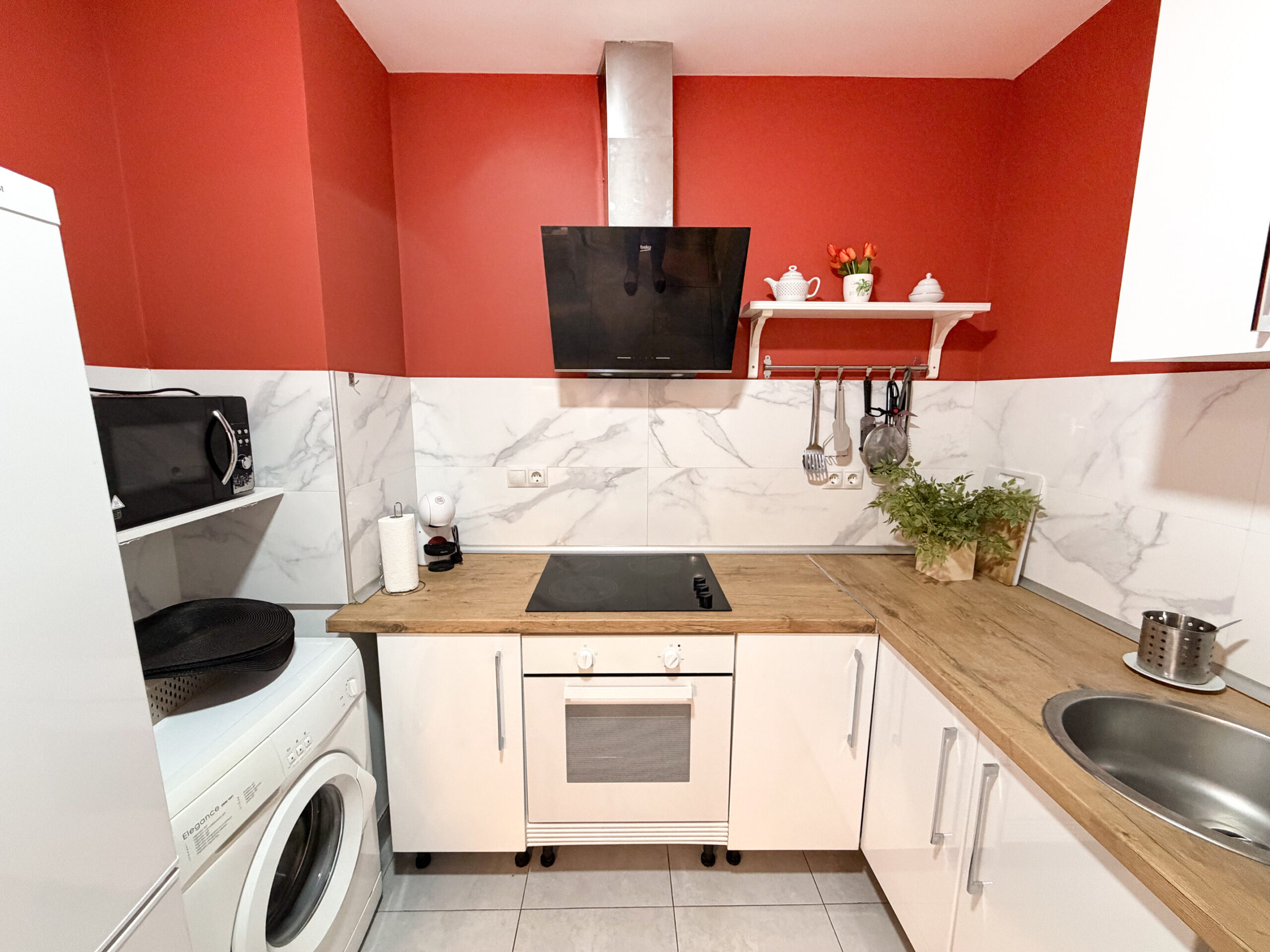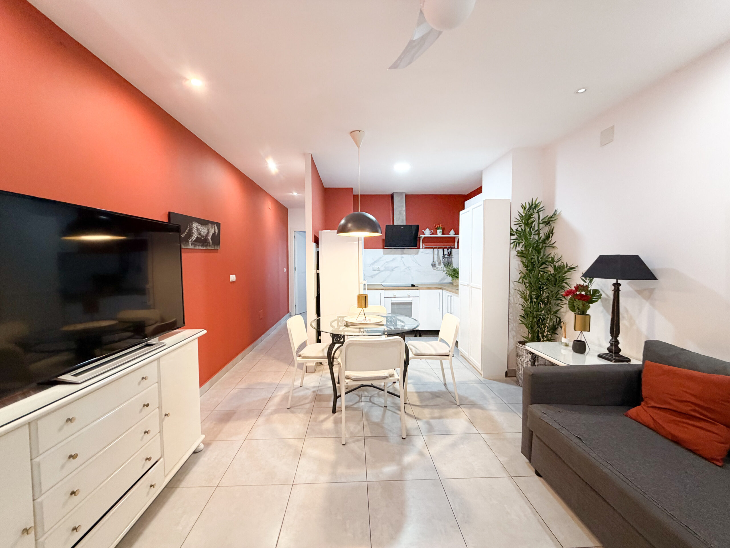 Asunnossa on yksi makuuhuone ja yksi kylpyhuone, ja koko tila on remontoitu modernilla ilmeellä. Olohuoneen lämpimät oranssit tehosteseinät tuovat kotiin viihtyisyyttä ja persoonallisuutta.